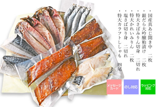 新しくなりました『ひまわり』 普段使いにもできる人気の干物をたっぷりと。 定番『かれいみりん』『紅鮭』『国産真あじ』『塩さば』をたっぷりと入れて、高級『銀だら』も2種類セットしました! 大人数の家族への贈答に、またご自...