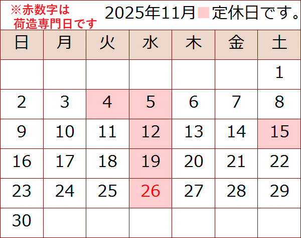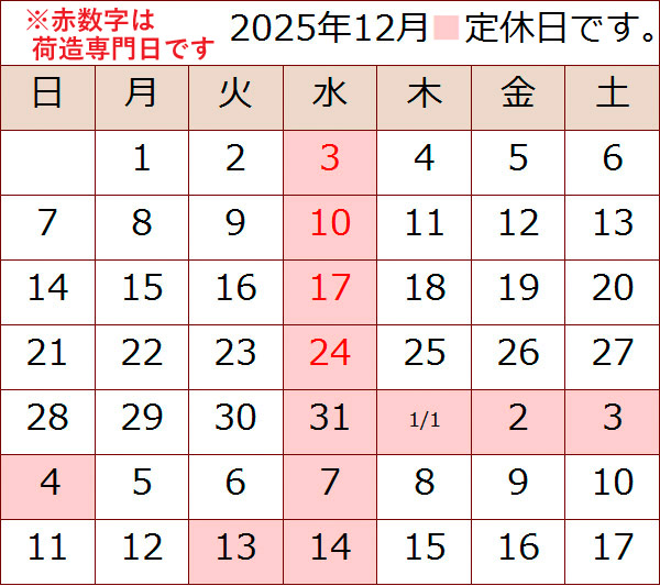 2025年11・12月の営業日です 2025年11月・12月の営業日です 11月は第一火曜4日と各週水曜日がお休みです。 お歳暮時期の水曜日は、『荷造り専門日として店頭販売はお休み』とさせていただきます。 ※長年勤めてくれた従業員が退職された為、人員が足りません。 11月半ばからの御歳暮発送も是非ご検討ください。 【 通常時 】 平日は9時~18時 日祭日は9時~17時の営業です。 Post Share Hatena Pocket RSS feedly Pin it