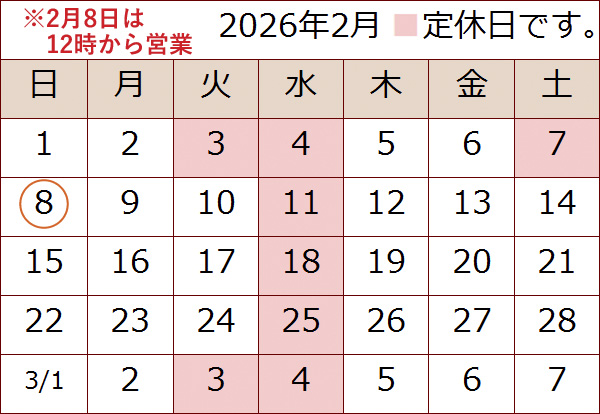 2026年2月の営業日です 2026年2月の営業日です 2月7日(土)に祝事でお休みをいただきます。 翌8日(日曜日)は12時からの営業とさせていただきます。どうぞよろしくお願いいたします。 【 通常時 】 平日は9時~18時 日祭日は9時~17時の営業です。 Post Share Hatena LINE RSS feedly Pin it note