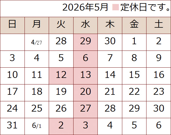 第一火曜日の定休日を、振り替えで12日(火)にいただいています。 どうぞお気を付けください。