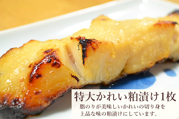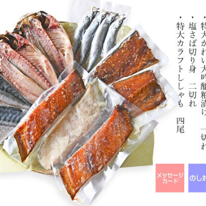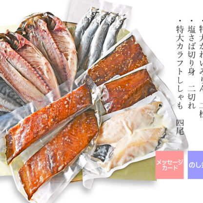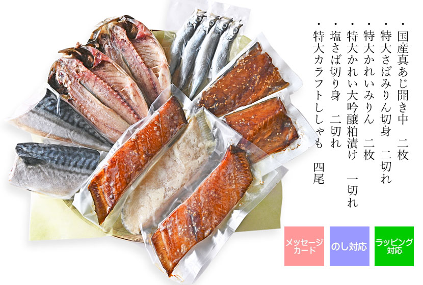 国産真あじ中2枚、塩サバ切り身2枚(片身分)、特大かれいみりん2枚、特大さばみりん切り身2枚、特大からふとししゃも4尾、特大かれい大吟醸粕漬1枚(銀だらみりん2枚・銀だら粕漬2枚に変更可能)