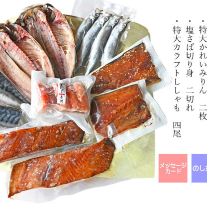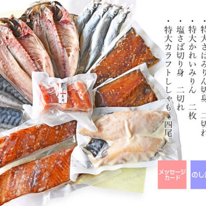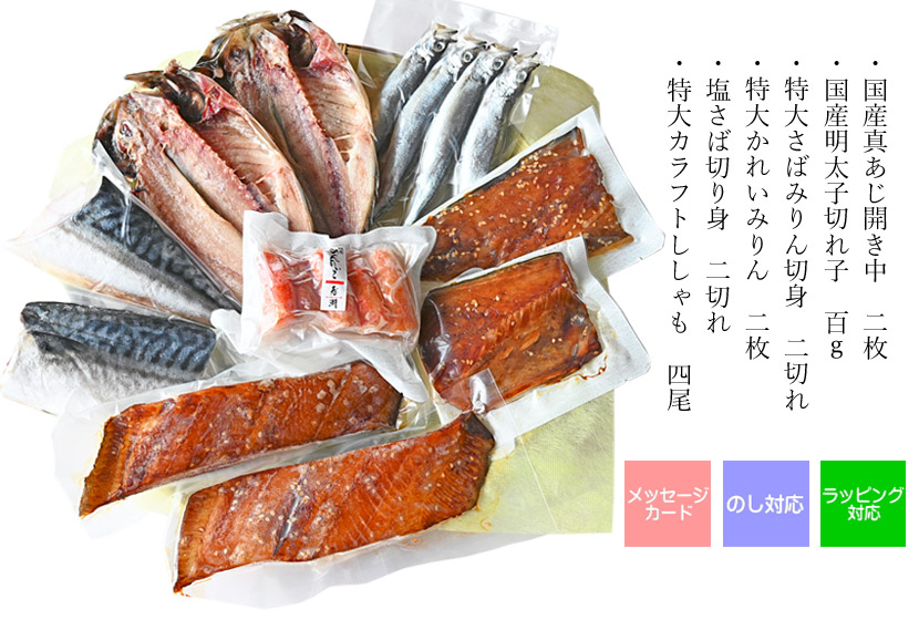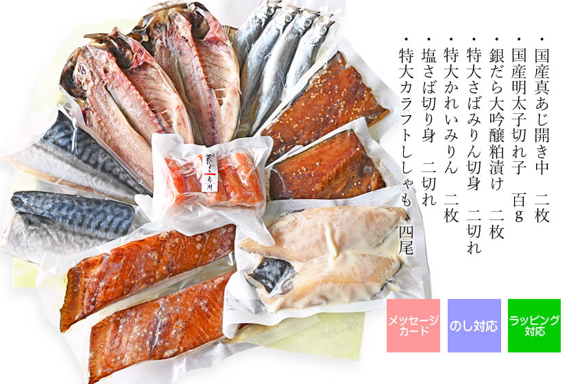 新『紅掛空明太子』6090円~ 画像は『紅掛空』。ざるの大きさは同じです 干物の保存方法・焼き方のしおりも入っています。 人気のセットに明太子をプラス お子様からご年配の方まで一緒に楽しめるバラエティにとんだセット『紅掛空』(べにかけそら)に、国産手作り明太子の切れ子を加えました。干物と国産の明太子両方を味わえる、自分にも送ってもらいたくなるような内容で、先様にもきっとご満足していただけると思います。もらった方にも嬉しい個別の真空にしています。(※国産真あじ中のみ通常袋です) そのまま冷凍保存ができて、一食ずつ好きなものを解凍してお召し上がりいただけるのも人気の一つです。 『紅掛け空明太子』セットに『銀だら』も3つの味から選んで加えることができます。 セット内容のご紹介 『紅掛空明太子セット』に銀だらも3つの味から選んで加えられます。 『紅掛空明太子』 『紅掛明太銀だら』 『紅掛空明太子』 送料込価格 『紅掛明太』:6090円『紅掛明太銀だら』:7070円 ※東北+300円、沖縄+500円、北海道+900円 セット名 新『紅掛空明太子』6090円~