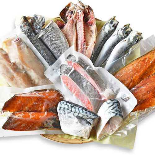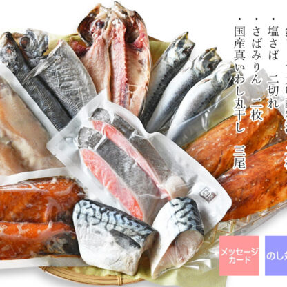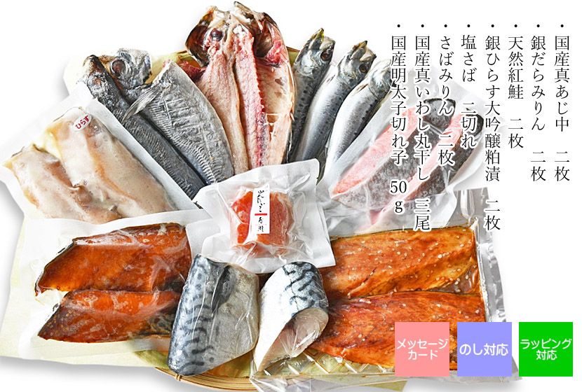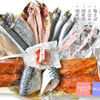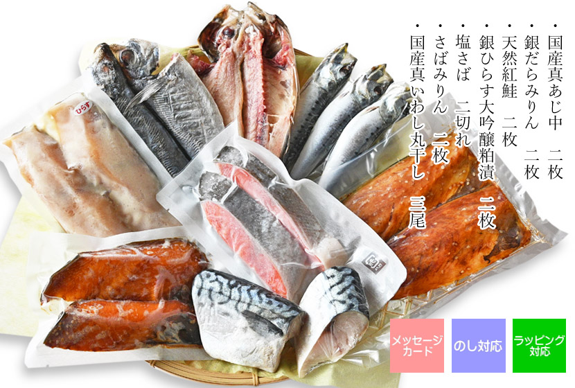 国産真あじ2枚、銀だらみりん2枚、厚切銀ひらす大吟醸粕漬2枚、さばみりん2枚、塩サバ切り身2切、国産真いわし3丸干し尾、国産手作り明太子切れ子50g(※選択時)
