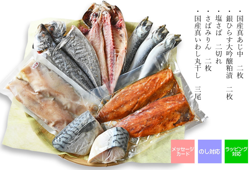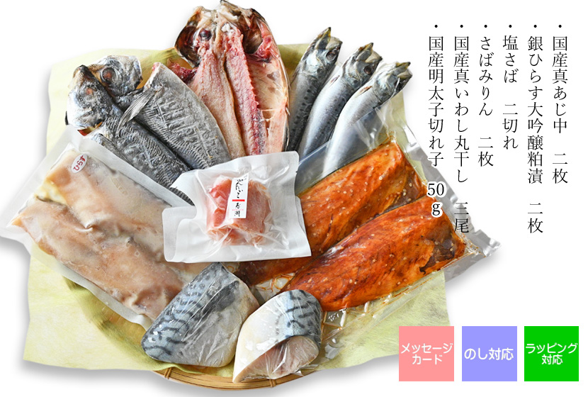 『千草』の”い”4280円・4820円 色々少しずつ味わえる 三種のセット い・ろ・は お二人暮らしの方に、少しずつ色々な味が楽しめるセットです。ご年配の方にもお勧めできますので、ご贈答にもどうぞ!『千草』のセットは全部で三種類です。用途に合わせてお選びください。三種のセットいずれも、国産の手作り明太子の入ったセットにできます。 【国産明太子入りも選べます】ご飯がすすむ粒々の国産明太子です。 セット内容のご紹介 『国産明太子』入りセットにもできます。 国産明太子入りも選べます。 『国産明太子』が入ったセット 『千草』の”い” 送料込価格 4280円4820円(明太有) ※東北+300円、沖縄+500円、北海道+900円 セット名 『千草』の”い”4280円・4820円 内容 国産真あじ2枚、厚切銀ひらす大吟醸粕漬2枚、さばみりん2枚、塩サバ切り身2切、国産真いわし3尾、国産手作り明太切れ子50g(※選択時) 送料 クール便送料込 東北+300円、沖縄+500円、北海道+900円 配送 ヤマト運輸 クール冷凍便 お願い 到着後は冷凍で保存して下さい。冷凍で2週間、解凍後は冷蔵で2日を目安にお召し上がりください。 セットへの追加商品一覧へ