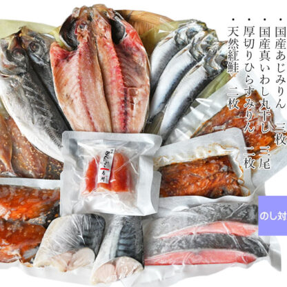 新『利休の は』5800円 ご年配の方に、気持ちを伝えたい ご年配の二人暮らしのご家庭に喜ばれるよう、品数を多く少しずつ色々な味を楽しめるよう詰め合わせました。天然紅鮭も入り、専門店が吟味した味を多くのご年配の方に楽しんでいただけたらと思います。 セット内容のご紹介 三種のセット 新『利休の は』 送料込価格 5800円 ※東北+300円、沖縄+500円、北海道+900円 セット名 新『利休の は』5800円 内容 国産真あじ中2枚、国産明太子切れ子50g、天然紅鮭2枚、厚切り銀ひらすみりん2枚、特大さばみりん切り身2枚、塩サバ切り身2枚、国産無着色あじみりん3枚、国産真いわし3尾 送料 クール便送料込 東北+300円、沖縄+500円、北海道+900円 配送 ヤマト運輸 クール冷凍便 お願い 到着後は冷凍で保存して下さい。冷凍で2週間、解凍後は冷蔵で2日を目安にお召し上がりください。 セットへの追加商品一覧へ